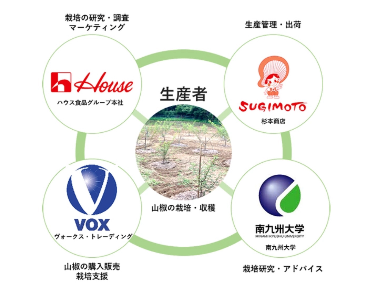该项目由House食品集团总部、旗下香料及香辛蔬菜采购销售公司Vox Trading、干香菇收购销售企业杉本商店、研究山椒的南九州大学,以及当地山椒生产者共同推进,旨在扩大山椒种植规模并打造品牌价值。